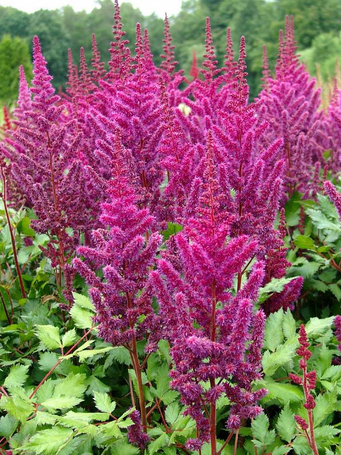 Рассада астильбы китайской Вижн ин Рэд (Visions in Red) – яркие стрелы темно-лиловых соцветий приковывают взгляды и добавляют яркие нотки любому саду. Плотно посаженные мелкие цветки насыщенного оттенка при взгляде издалека сливаются в яркое сиреневое облако, остановившееся над блестящей зеленой листвой.