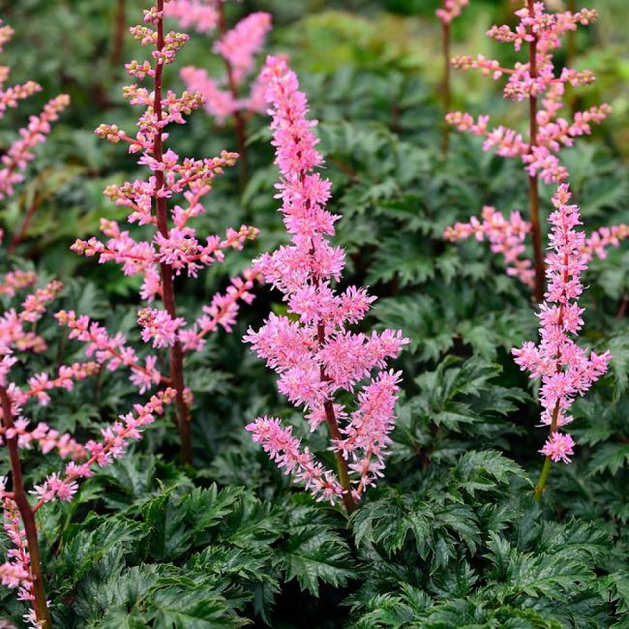 Рассада Астильбы курчавой Перкео (Perkeo) вырастает до 20 сантиметров в высоту. Из семян получаются миниатюрные растения, которые отлично подходят для озеленения. Цветение происходит с последней декады июня до первой половины августа. Подходящее место для посадки - вблизи воды либо во влажных тенистых местах. Пышные соцветия представляют собой конусообразные ярко-розовые цветки с ажурными листьями. Листья в начале цветения отличаются бронзовым отливом. Кусты отлично смотрятся среди декоративных хвойных пород. К особенностям Астильбы курчавой Перкео можно отнести: