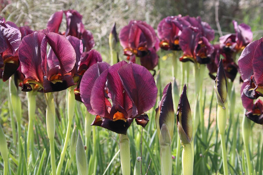 Ирис карликовый "Дарк Овер" - это удивительное растение с темно-бордовыми, насыщенными цветками, которые привлекают взгляд своей красотой. Этот сорт ириса пумила отличается компактным размером до 35 см, что делает его идеальным выбором для оформления горшков, клумб и рабаток. Листья имеют интересную форму, что добавляет декоративности этому растению.