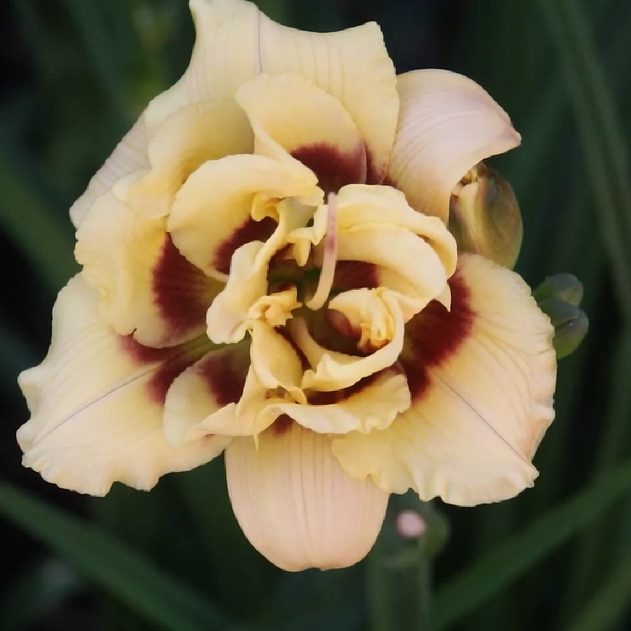 Окраска цветка : кремово-жёлтый с бордовым глазком и зелёным горлом