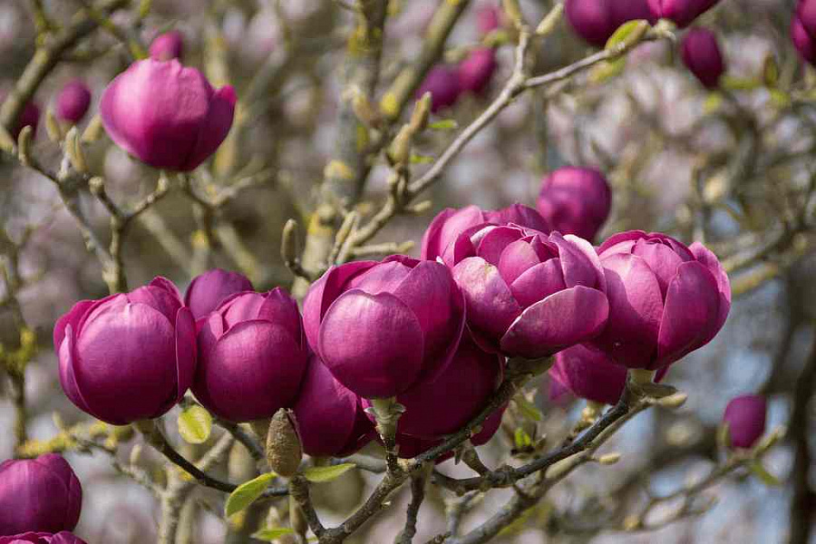 Саженцы магнолии гибридной Блэк Тюлип (Black Tulip): весной создается впечатление, что декоративные деревья покрываются настоящими большими тюльпанами. Цветение начинается в середине весны, крупными темно-лиловыми цветами. Листья зеленые, продолговатые, распускаются немного позже. Форма кроны очень раскидистая, ветвление начинается низко от земли. Взрослые крупномеры вырастают до 4 м в высоту. Магнолия гибридная Блэк Тюлип плодоносит яркими красными плодами. Достоинства: